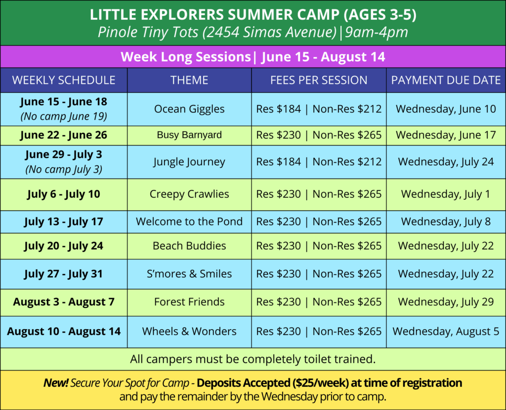 Pinole camps are the perfect place to make new friends and explore engaging activities including arts and crafts, games, and outdoor fun! Camp runs daily from 9:00 AM to 4:00 PM.